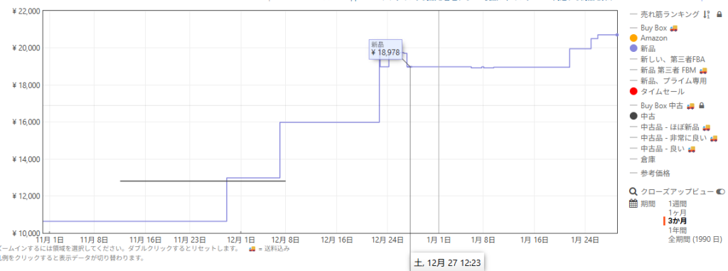 下図はアマゾンでのDDR4-16GB1枚の商品の値段推移ですが、12月中にどんどん上がって12月後半には倍くらいになっています。