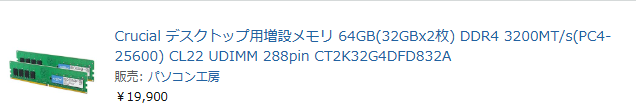 注文履歴みると64GB19900円ですよ…。DDR4ではありますが、こんなに安かったのです。