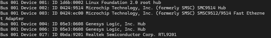lsusbコマンドからもUSBとしてLANが見えます。SMC9514というチップがUSB+LANの実装でFast Ethenet Adapterという名前で見えています。