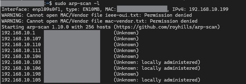 と出ていれば、 スキャン対象は 192.168.10.0/24 になります。つまり256端末分のIPを検索するということになりますね。