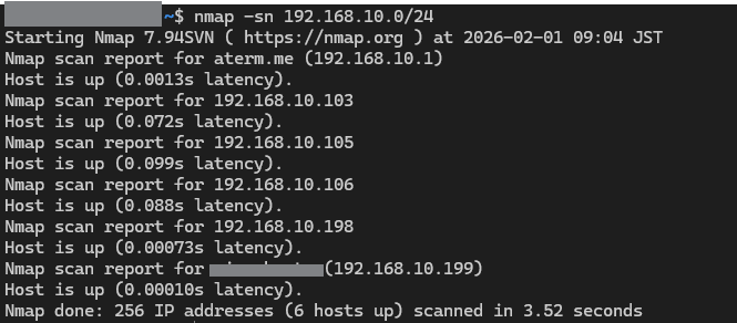 上記の例ではAterm192.168.10.1がルーターで、ほかに自分以外(192.168.10.199)に4つホストがいることが分かります。