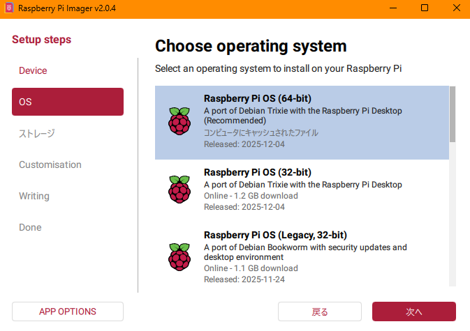 選択肢はRaspberry Pi OSが一番上にきていて、他のOSを入れることもできます。基本的にRaspberry PiにはRaspberry Pi OSを使った方がいろいろ使いやすい面が多いと思います(コマンドとか負荷とか)