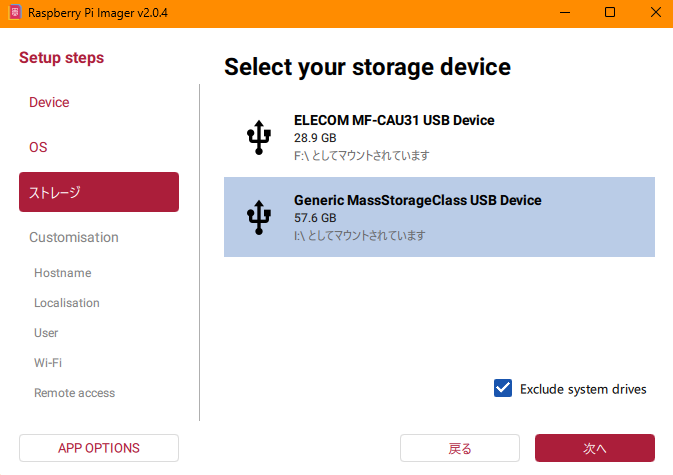 ストレージを選択します。SDカードのドライブを選んでください。間違えると内容が消えるので他に刺さっているUSBメモリとかを間違って選択しないようにしましょう。