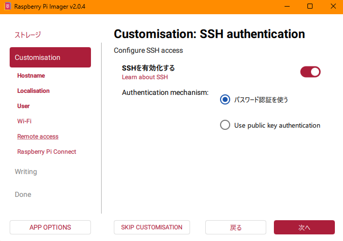 モニターを繋がない場合は、SSHでラズパイにアクセスすることになるので、ここでSSHを有効にしておきましょう。キーも使えますが初回アクセスはPASSでアクセスの方が楽かなと思います。