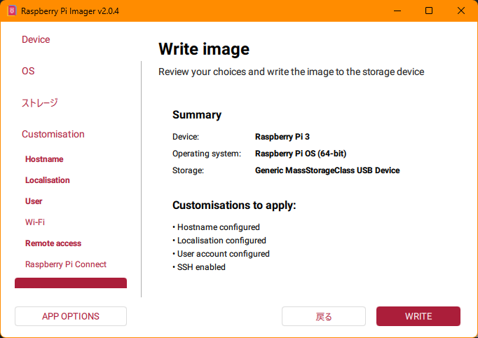 設定ができたら「WRITE」を実行します。数分待てば、自動でOSが書き込まれます。